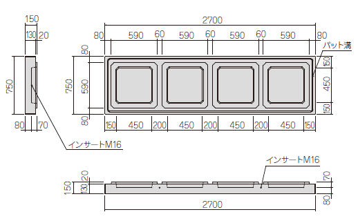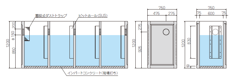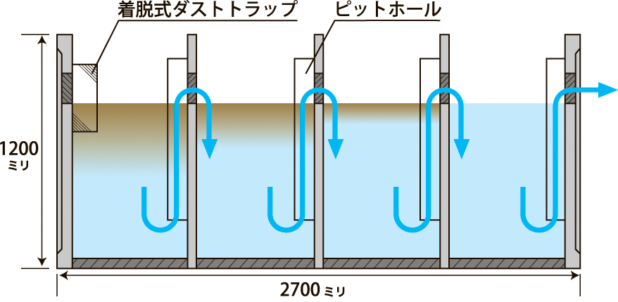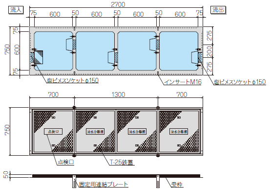 製品規格は内径600×600mmの分離槽を4連式に連結した一体式。外径は2700×750とコンパクトに収まっています。